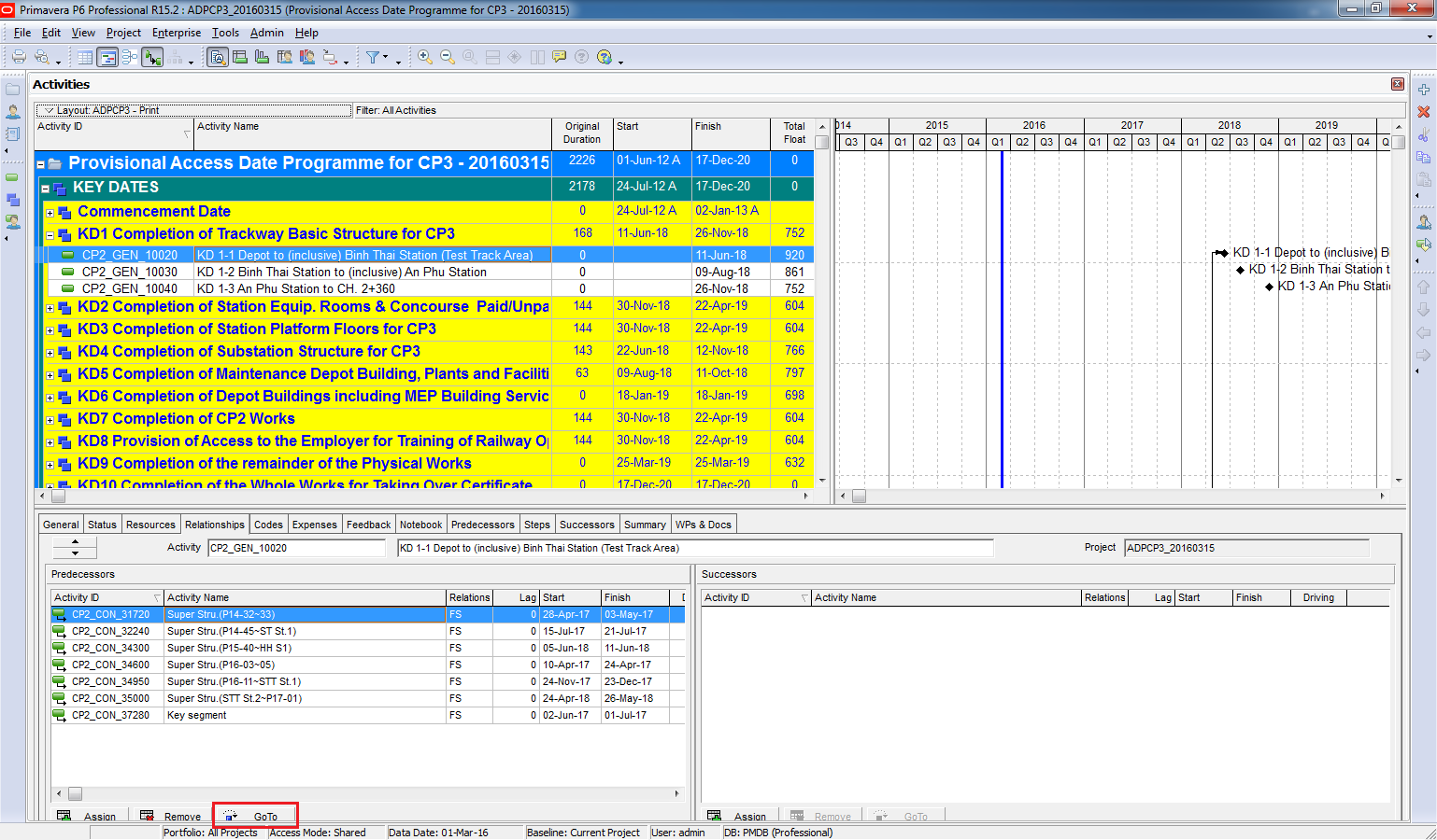 When you click Go To, Primavera will jump to that predecessor and automatically expand its WBS.