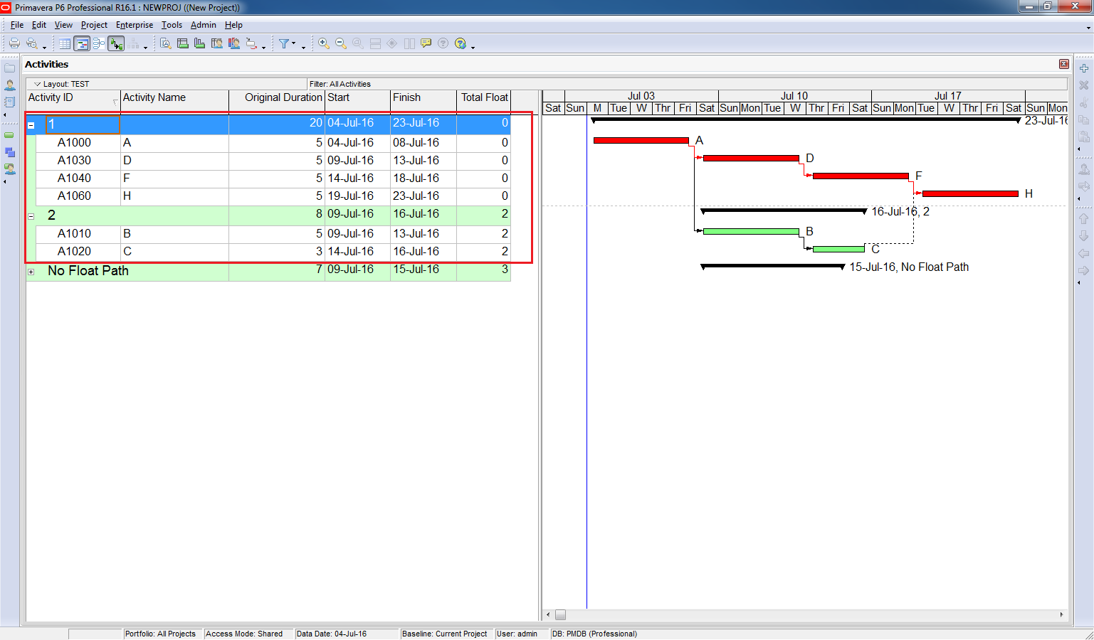 Primavera will now display multiple critical paths. For example: