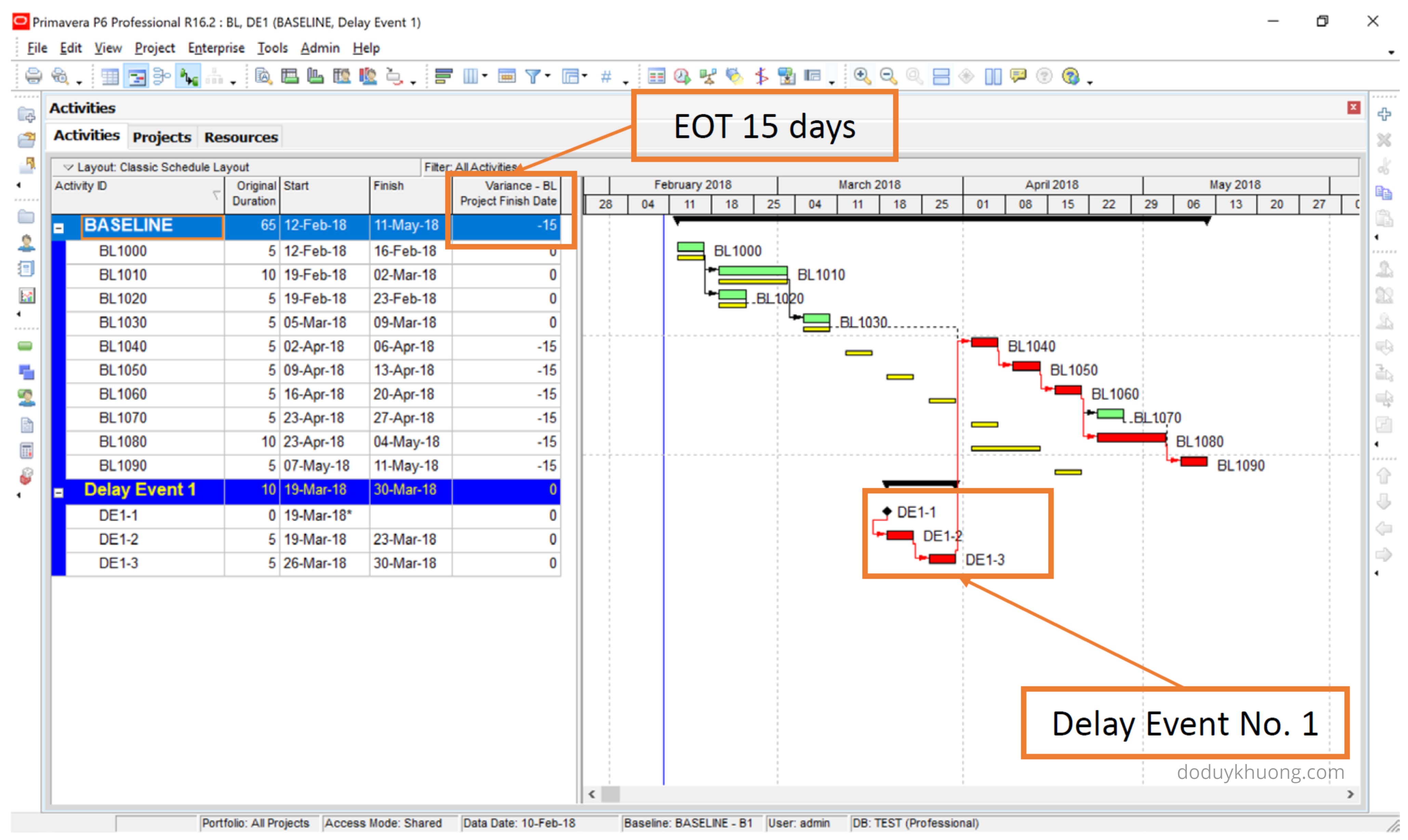 Benefit of using Primavera P6 in Delay Analysis-8: Impact of delay event No. 1 on Project Completion Date