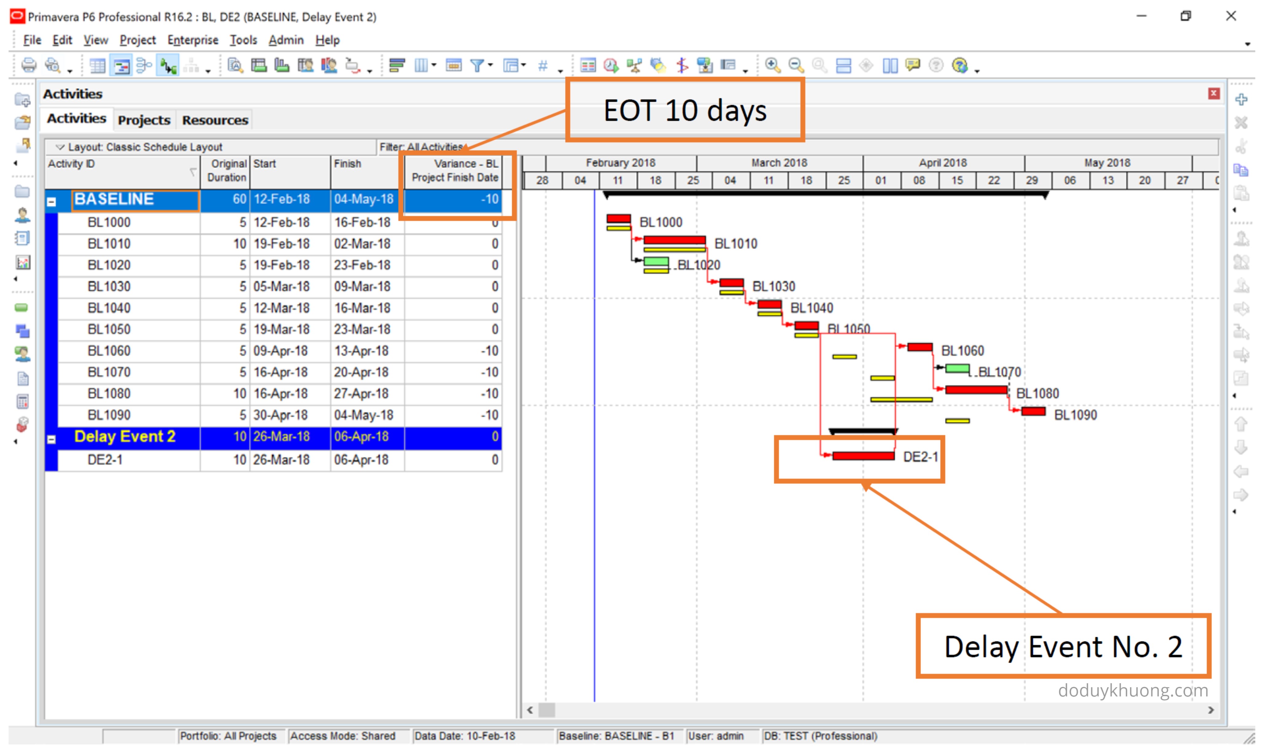 Benefit of using Primavera P6 in Delay Analysis-10: Impact of delay event No.1 and No. 2 on Project Completion Date