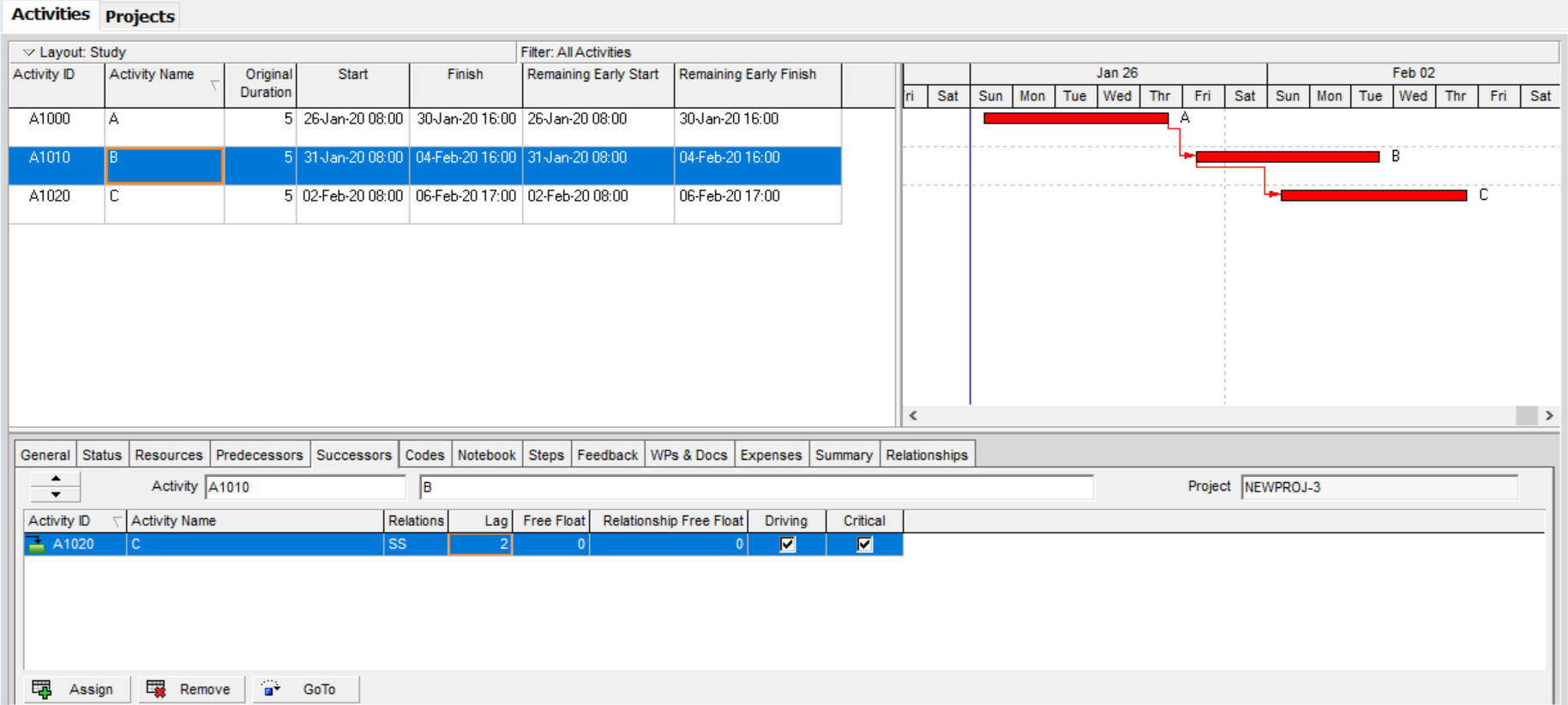 • Activity B has SS relationship with Activity C with a lag value of 2 days.