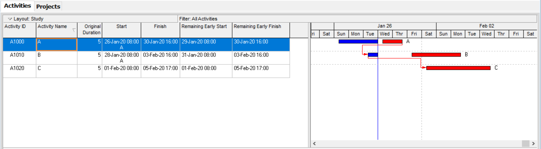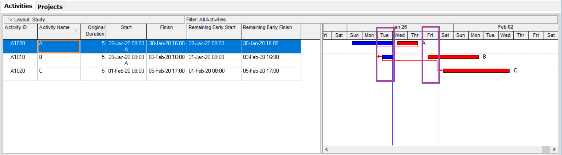 The start date of activity C will be determined depending on which option is selected in Schedule Options:
