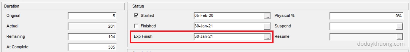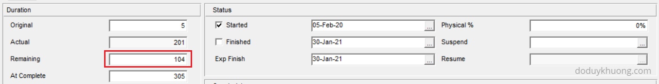 If the activity has an Expected Finish constraint, the Remaining Duration is automatically calculated as the time between the Data Date and the Expected Finish date. This prevents manual updates to the Remaining Duration.
